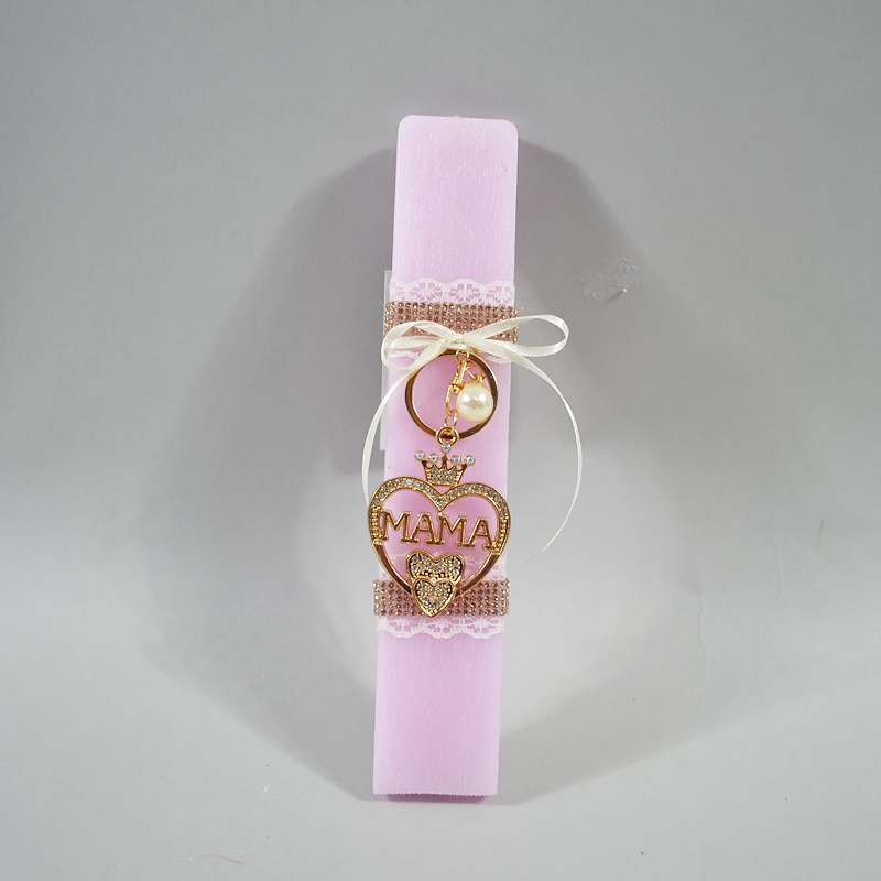 Χειροποίητη αρωματική πλάκα λαμπάδα 23 εκ. σε λιλά απόχρωση, διακοσμημένη με λαμπερά στρας και συνοδευόμενη από μπρελόκ με χάραξη "Μαμά".